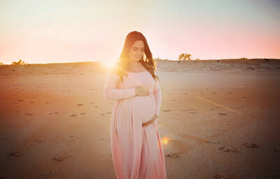 A Sunrise Session at Cocoa Beach offers the magical beauty of the soft, golden light of the early morning sun as it gently illuminates your growing belly. The serene backdrop of the beach and waves creates an intimate, peaceful atmosphere — perfect for capturing the glowing excitement of this special time in your life.
